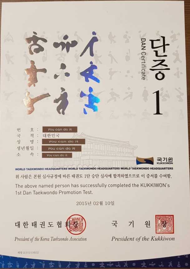 2015년 2월에 취득한 태권도 1단