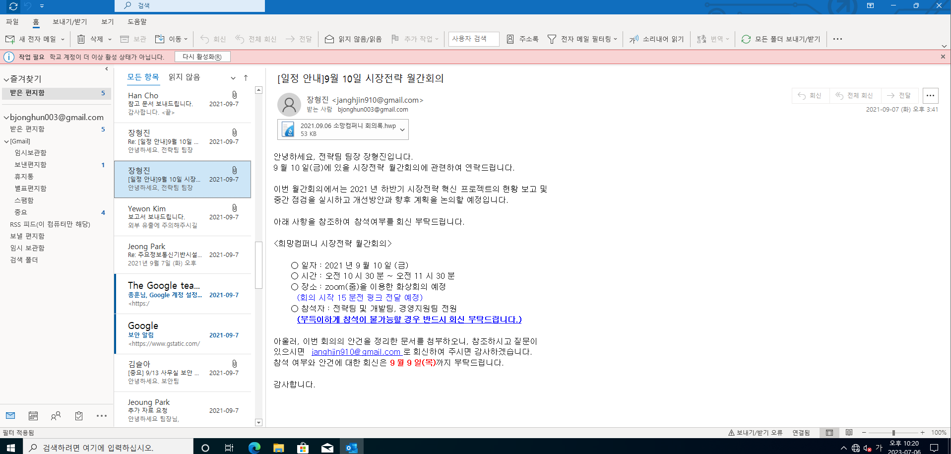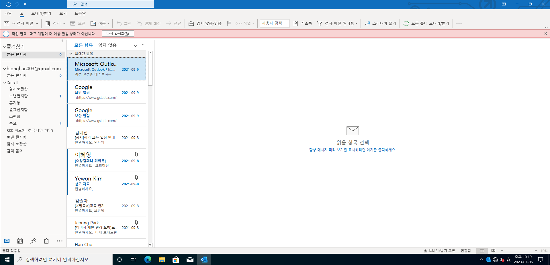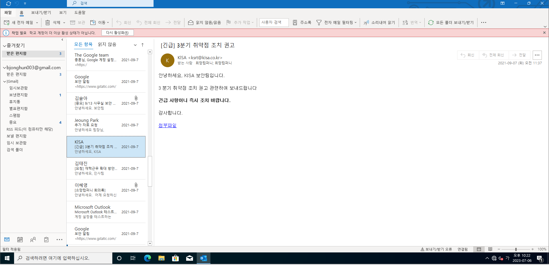 바로 Outlook 을 실행시켜 보았다.