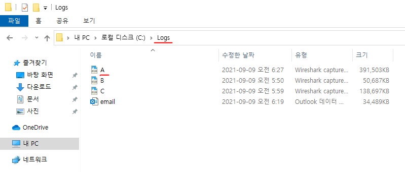 Logs 폴더에서 A, B, C 패킷파일이 있는것을 확인했다.