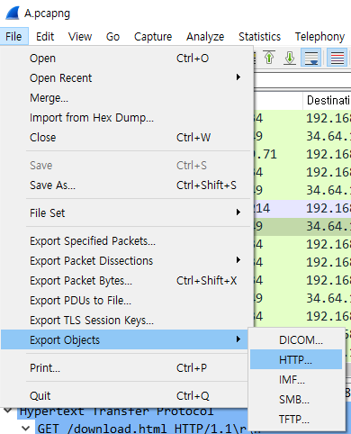 Wireshark 에서 File - Export Objects - HTTP 를 선택해준 다음