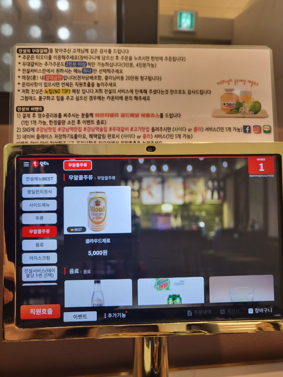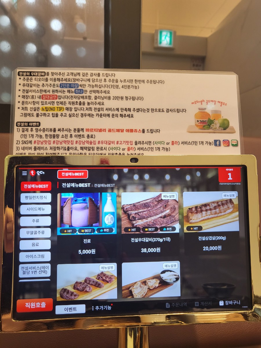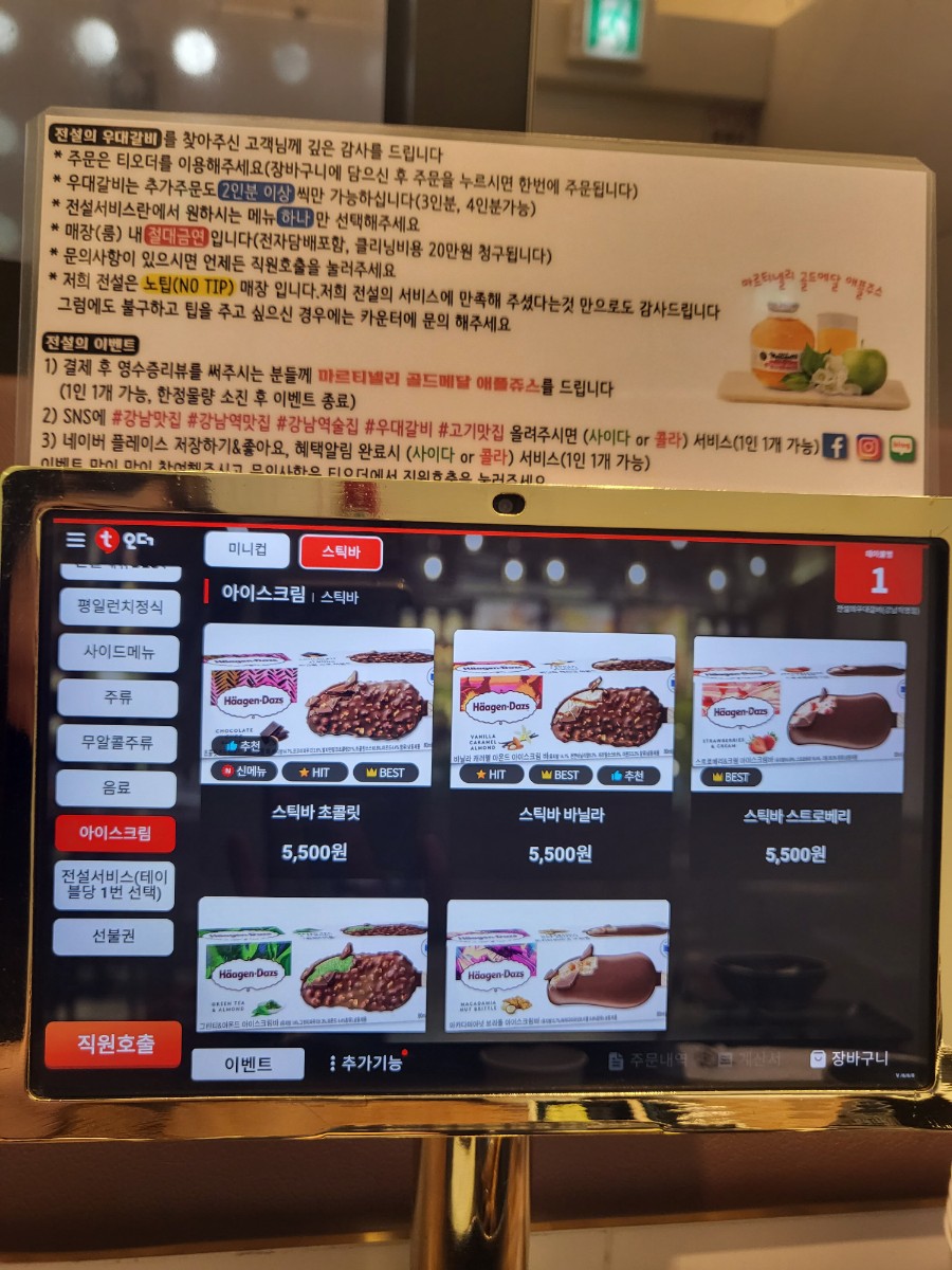 아래는 테이블마다 비치된 키오스크와 메뉴 사진이다.