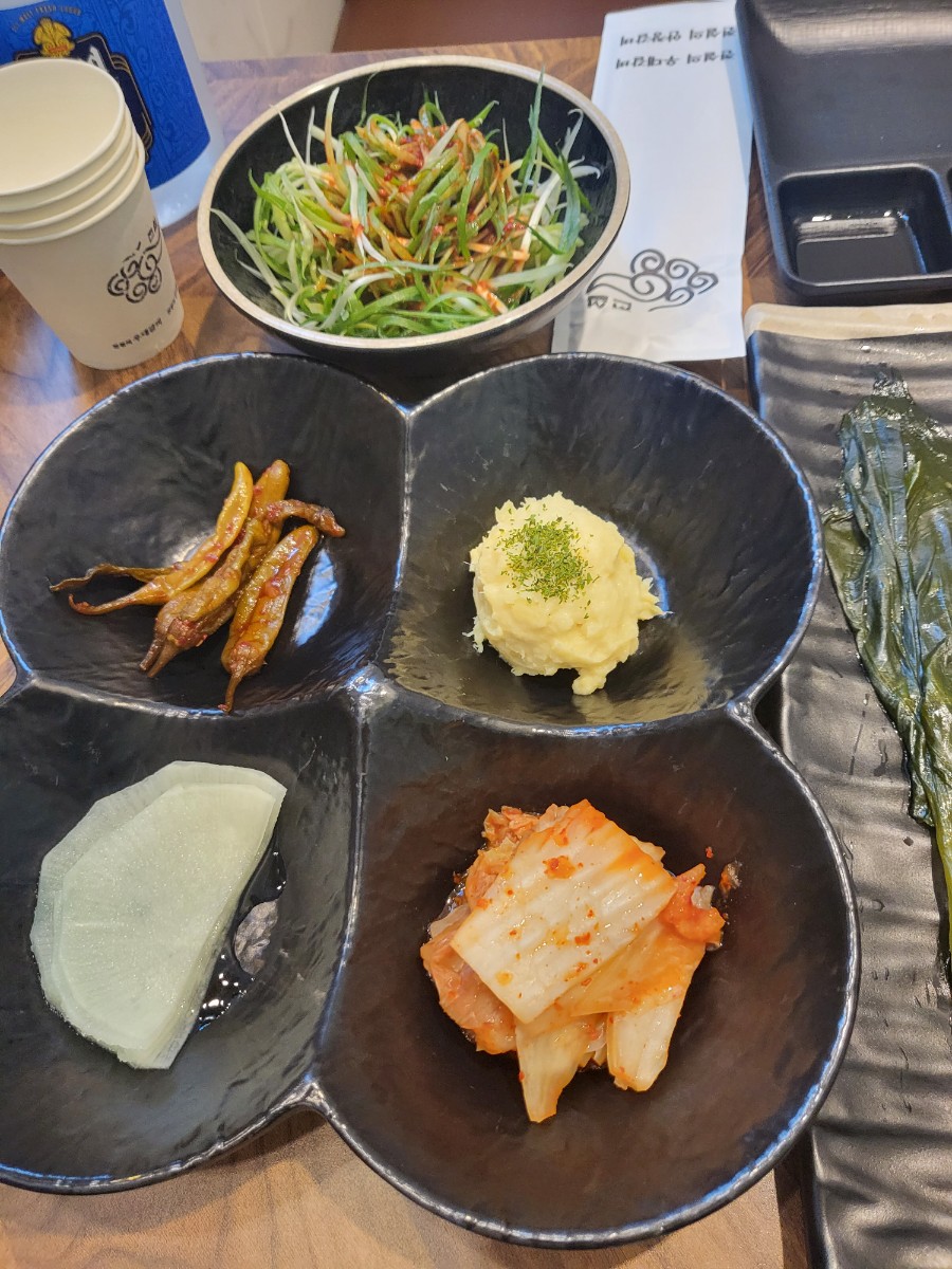 왼쪽에는 무쌈, 김치, 고구마샐러드, 고추장아찌, 명이나물, 와사비 등이 있었다.