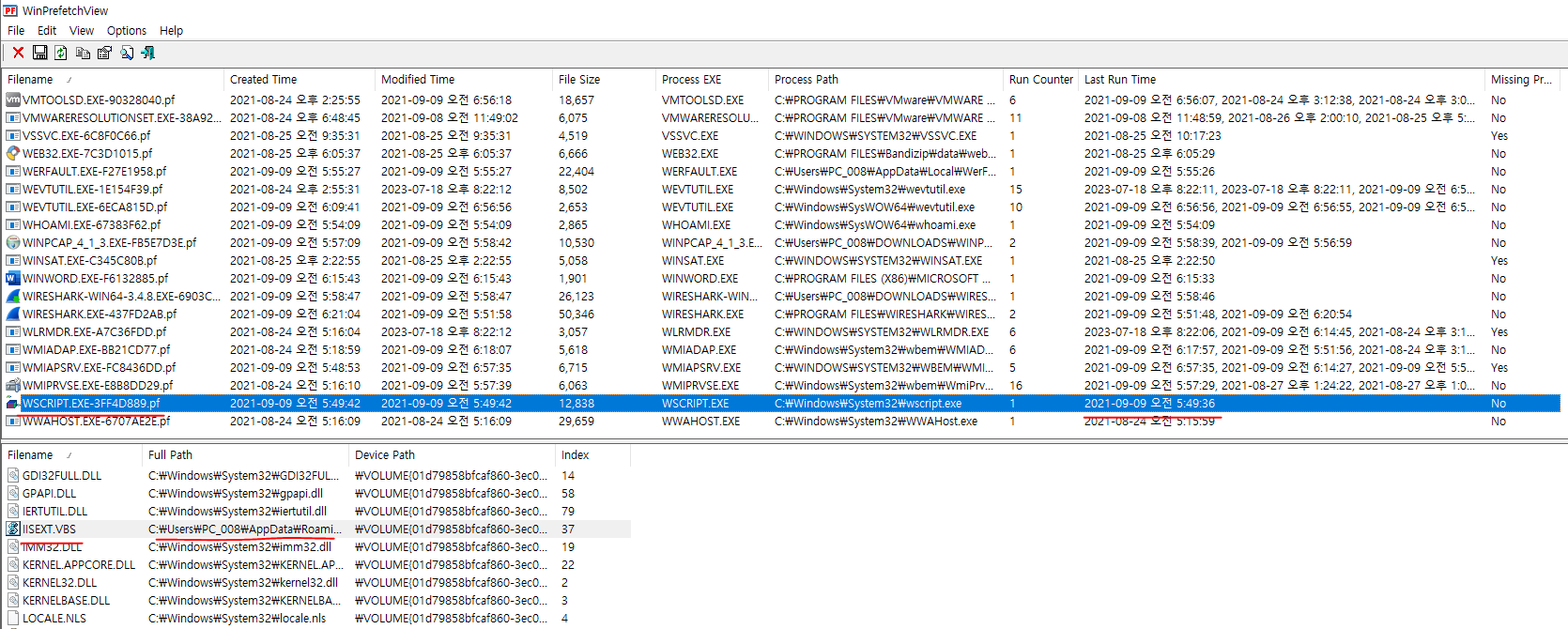 아래쪽으로 내리면 WSCRIPT.EXT.pf 파일을 찾을 수 있다.