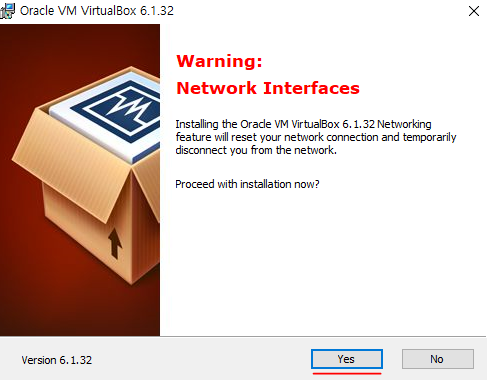 VirtualBox 설치중에 네트워크가 일시적으로 안될수 있다는 경고메세지가 뜬다.