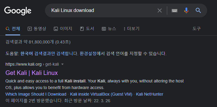 맨 위에 칼리 공식 홈페이지 링크가 나온다.