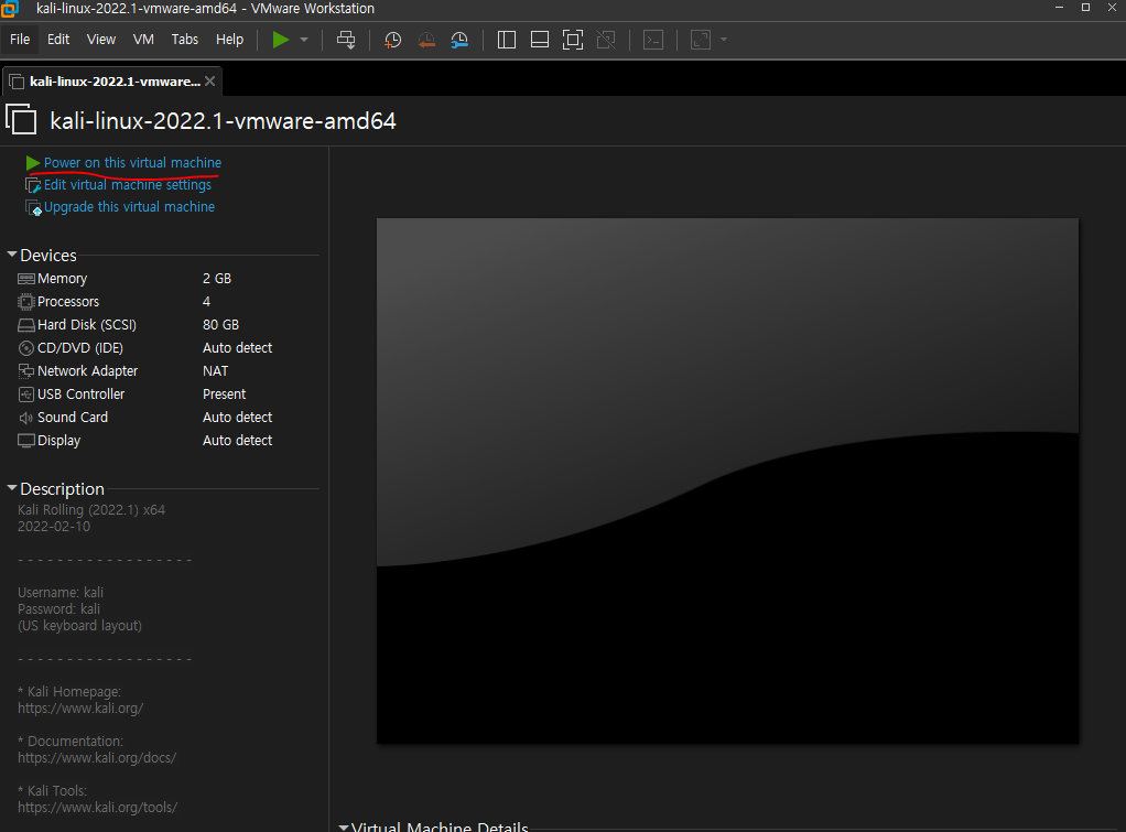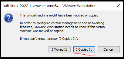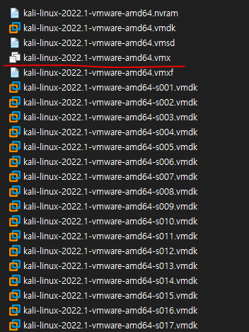이중에 kali-linux-2022.1-vmware-amd64.vmx 파일을 더블클릭해서 실행해 준다.