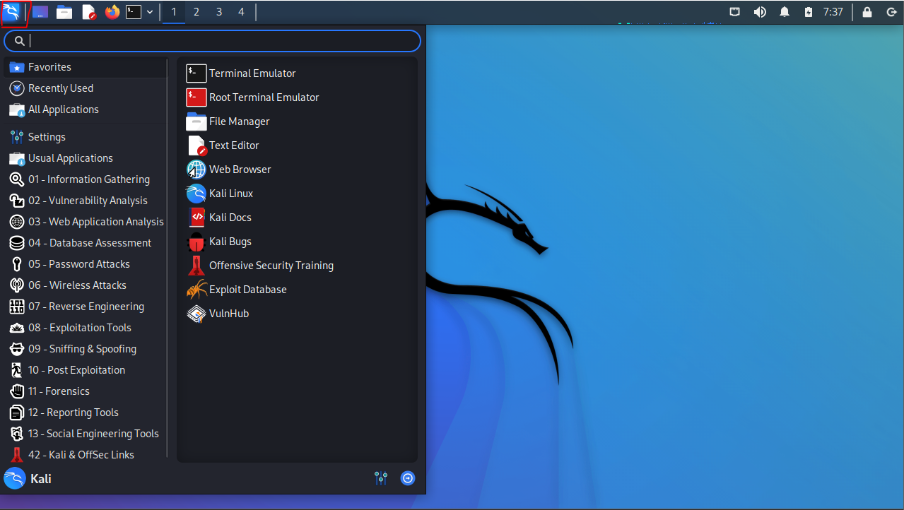 칼리 리눅스에 내장되어 있는 다양한 툴들을 확인할 수 있다.
