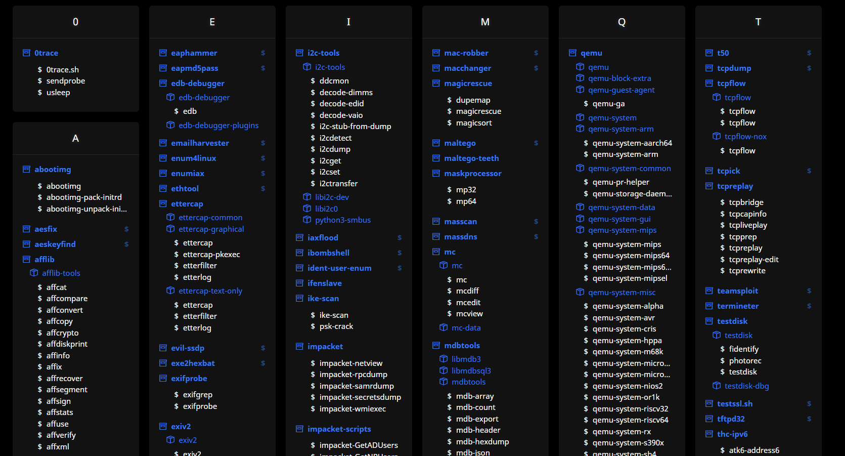 여기 보이는것들이 공식홈페이지에서 소개된 칼리리눅스 내장 도구 목록이다.