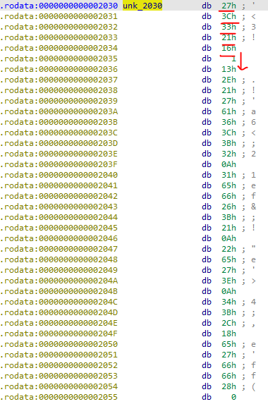 unk_2030 = '\x27\x3c\x33\x21\x16\x01\x13\x2e\x21\x27\x61\x36\x3c\x3b\x32\x0a\x31\x65\x66\x26\x3b\x21\x0a\x22\x65\x27\x3e\x0a\x34\x3b\x2c\x18\x65\x27\x66\x66\x28'