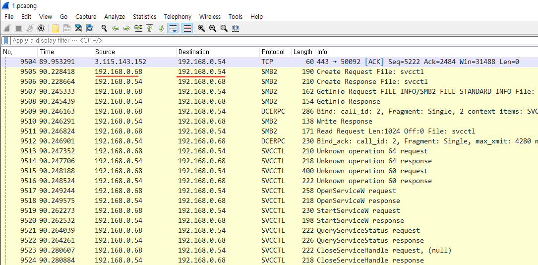 엄청난 SMB 프로토콜 통신이 있는것을 발견할 수 있다.