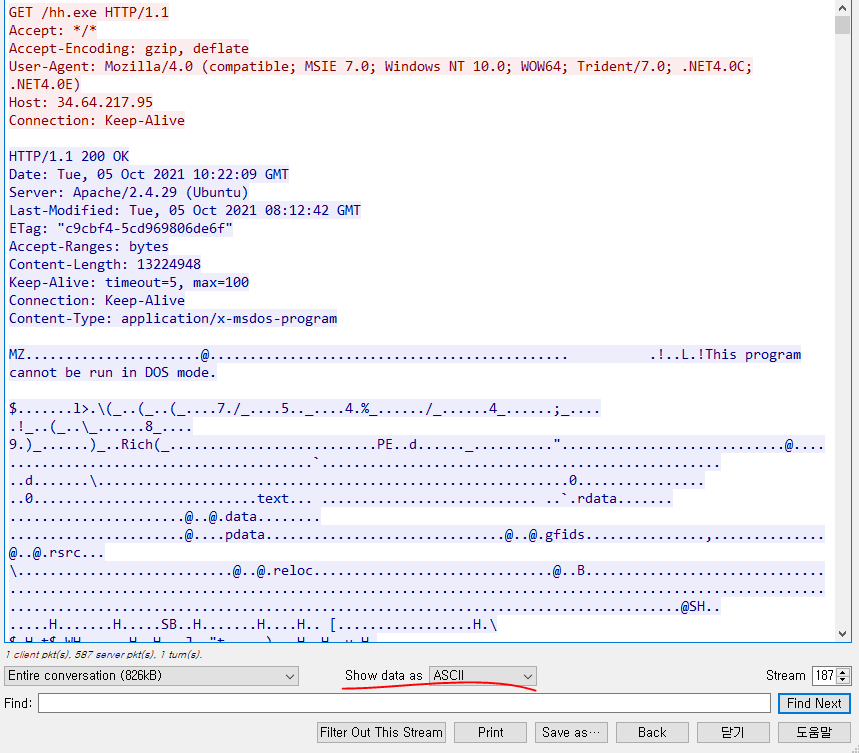 Show data as를 ASCII 에서 Raw 로 바꿔준 뒤