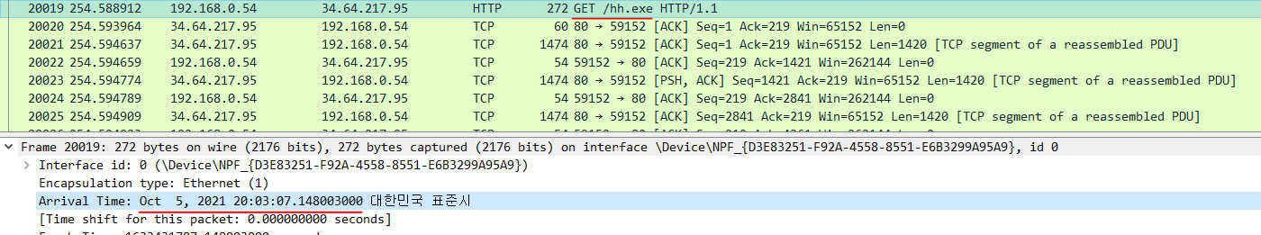 C:\Logs 폴더의 2.pcapng 에서 hh.exe 필터링 해서 찾았었는데