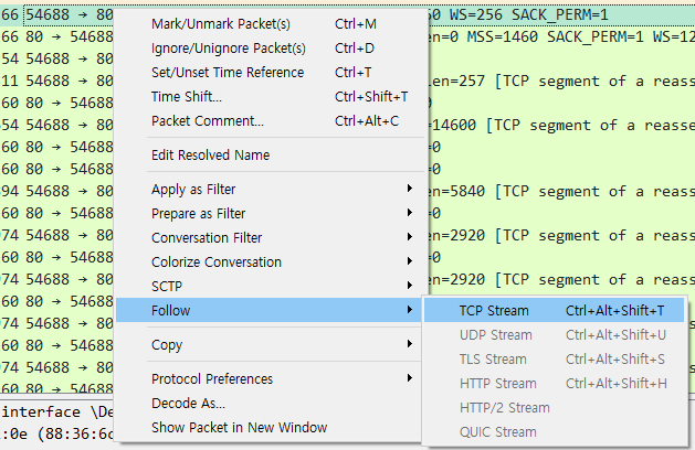 우클릭 - Follow - TCP Stream 을 눌러보면