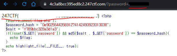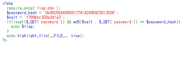 md5(salt. $_GET['password']) 의 값이