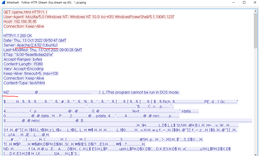 MZ로 시그니처로 시작하는 응용프로그램을 다운받은것을 확인할 수 있다.