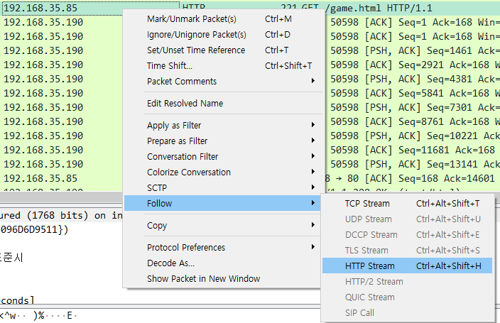 우클릭 - Follow - HTTP Stream 을 해서 자세히 살펴보면