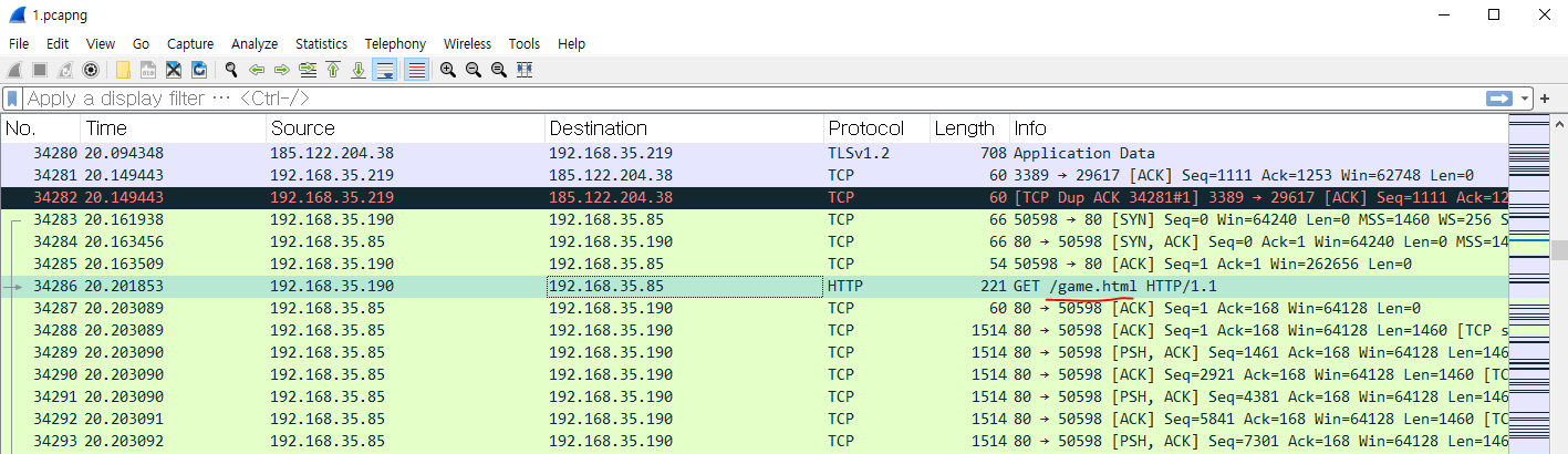 18:50:47 에 192.168.35.82/game.html 에 접속한 기록을 찾을 수 있다.
