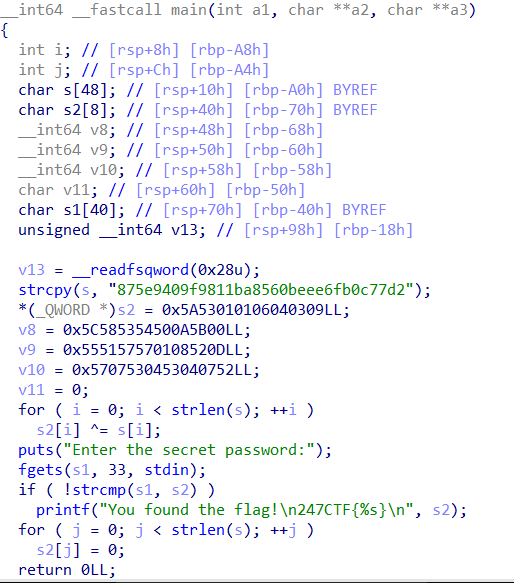 s2와 일치하는지 확인 후 flag를 찾았다는 문구의 출력여부를 결정한다.