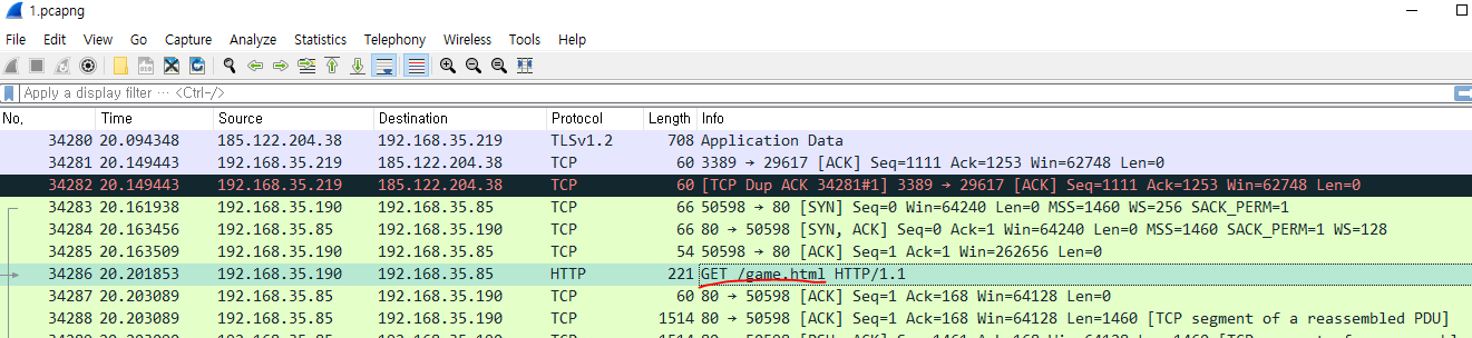 1.pcapng 파일을 wireshark 로 열어보면