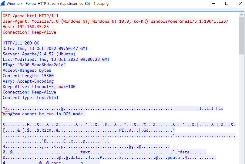 MZ 헤더로 시작하는 파일을 다운로드 받은것을 확인할 수 있다.
