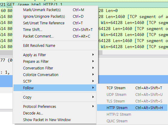 우클릭 - Follow - HTTP Stream 을 눌러 자세히 보면