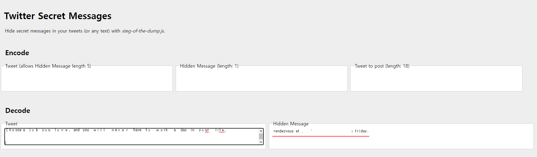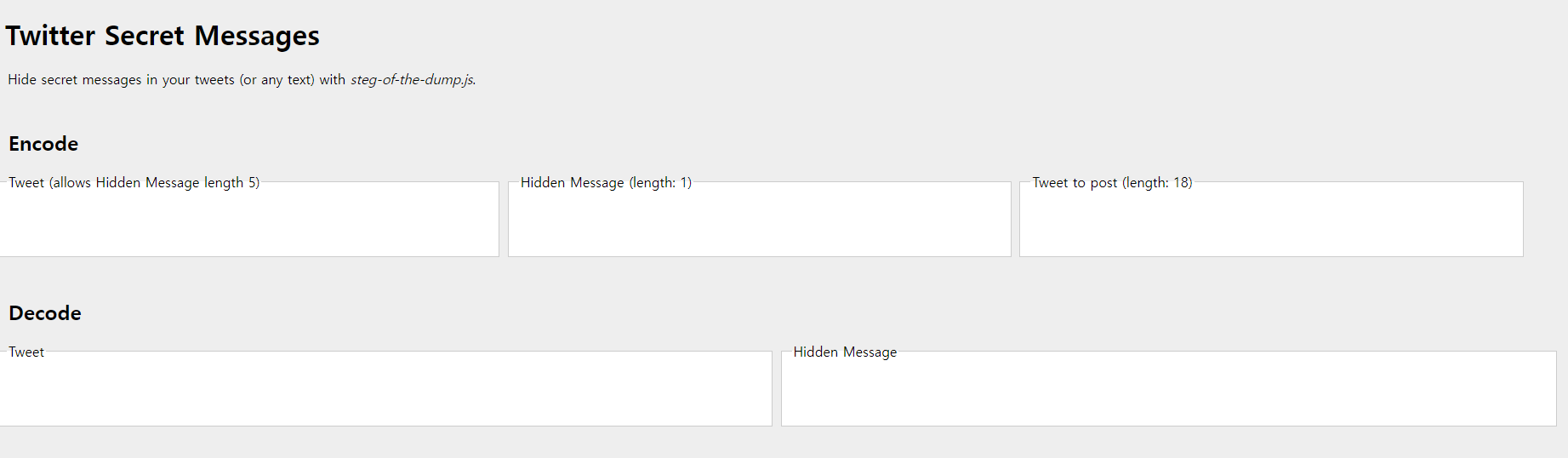Hide secret messages in your tweets (or any text) with steg-of-the-dump.js. Tweet i had a great day at the beach! #sunshine Hidden Message kidnapped by pirates Tweet to post Warning: Not all of Hidden Message stored in tweet. Add more text (e.g. spaces) to