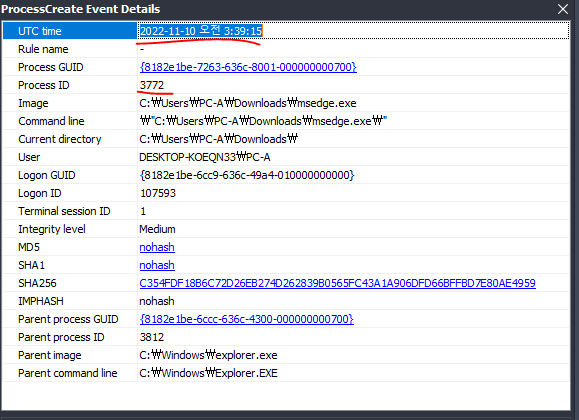 Downloads 폴더 아래 있는 msedge.exe 가 의심스러웠다.