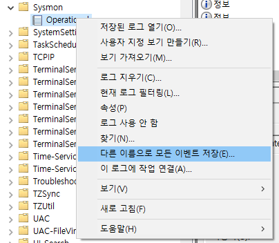 Sysmon 로그를 우클릭 - 다른 이름으로 모든 이벤트 저장을 눌러준 후