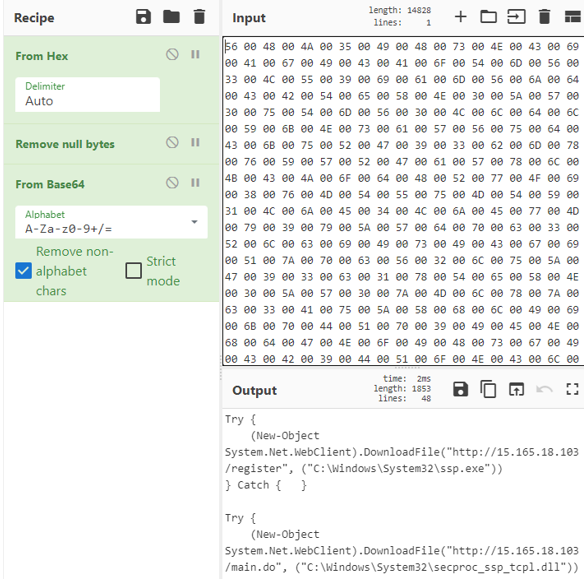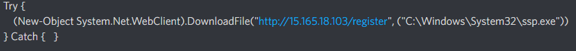 http://15.165.18.103/register 로부터 ssp.exe 파일을 다운받는 스크립트이다.
