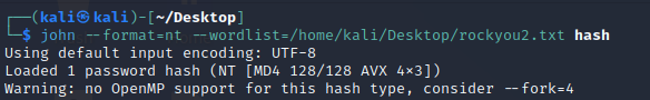 wordlist 를 rockyou.txt 파일로 지정하여 툴을 실행시키면