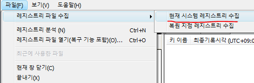 파일 - 레지스트리 파일 수집 - 현재 시스템 레지스트리 수집을 해서