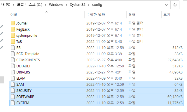 SAM, SECURITY, SOFTWARE, SYSTEM 과 같은 하이브 파일을 분석한다.
