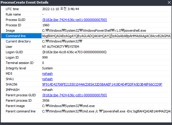 파워쉘로 뭔가 인코딩된 명령어를 실행한 것이 확인된다.