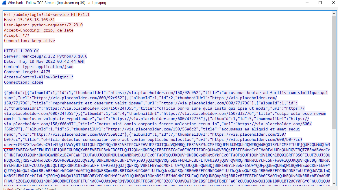 user 라고 되어있는 파라미터에 Base64 인코딩된 값이 들어있는 것을 볼 수 있다.