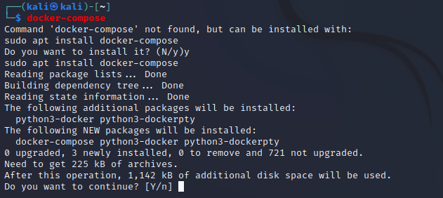 그럼 칼리 리눅스에서 docker-compose 패키지를 찾아온다.