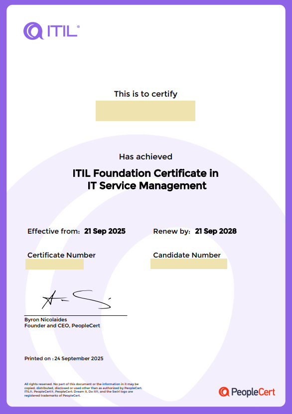 2025년 9월 취득한 ITIL V4 Foundation 자격증