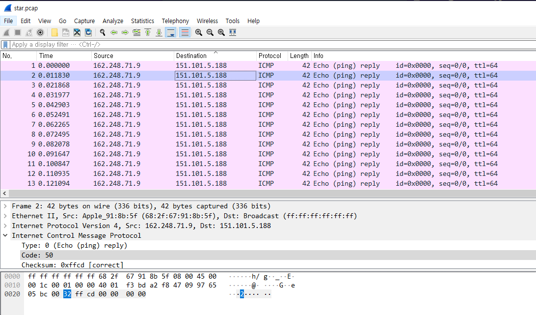 162.248.71.9에서 151.101.5.188 ICMP 패킷(ping)을 계속 날리고있는걸 확인할 수 있다.