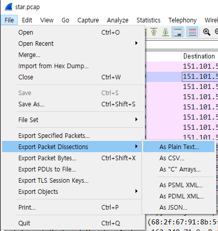 Wireshark에서 File - Export Packet Dissections - As Plain Text 메뉴를 선택하면
