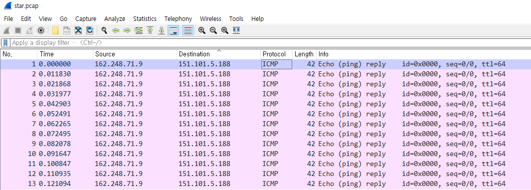 162.248.71.9에서 151.101.5.188 ICMP 패킷(ping)을 계속 날리고있는걸 확인할 수 있다.