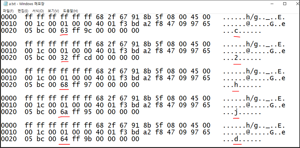 패킷의 거의 마지막 부분을 보면 현재 파란색으로 블록잡혀있는 부분(63)만 다른값으로 변하는걸 확인할 수 있다.