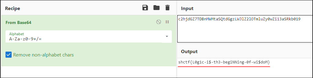 해당 부분의 값을 다 모으면 c2hjdGZ7TDBnMWMtaSQtdGgzLWJlz2loTmluZy0wZi13aSRkb019 라는 값이 나온다.