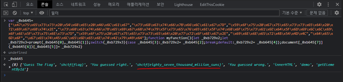 콘솔의 결과창에서 플래그가 출력되는것을 확인할 수 있다.