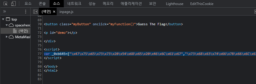맨 밑에쪽에 보면 <script> 태그 사이에 뭔가 알수없는 복잡한 값들이 있는걸 확인할 수 있다.