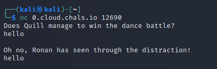 접속하면 Does Quill manage to win the dance battle? 라는 메세지가 출력되고,