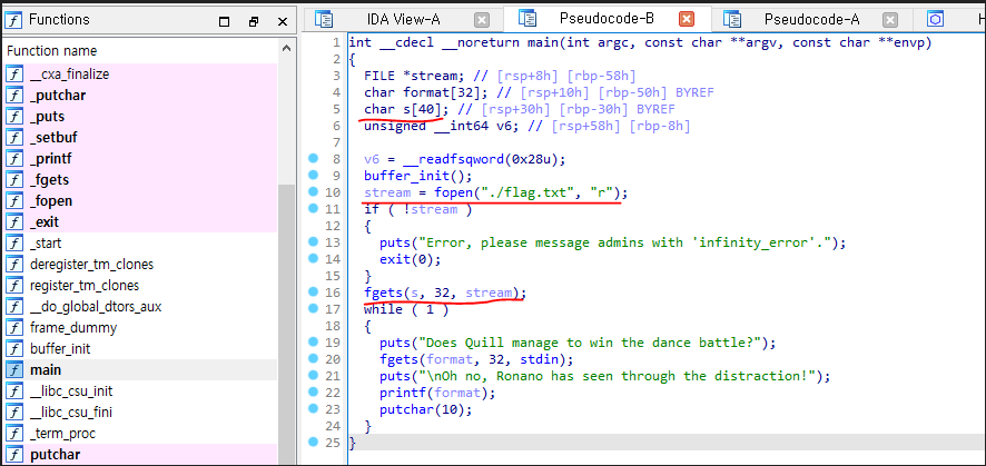 char format[32] 변수를 선언(rsp+10h)한 다음에 char s[40] 변수를 선언(rsp+30h)한 것을 확인할 수 있다.