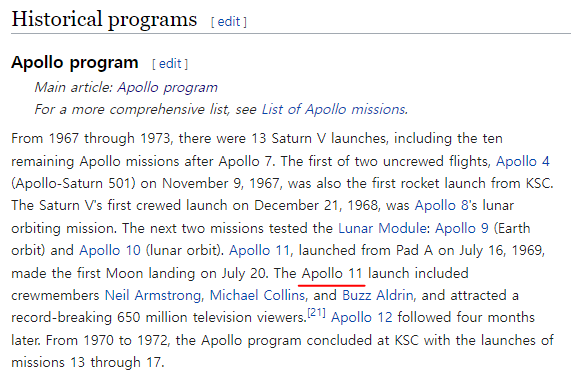 수많은 검색결과 중에 위키피디아에 있는 Kennedy Space Center 문서를 들어가봤다.