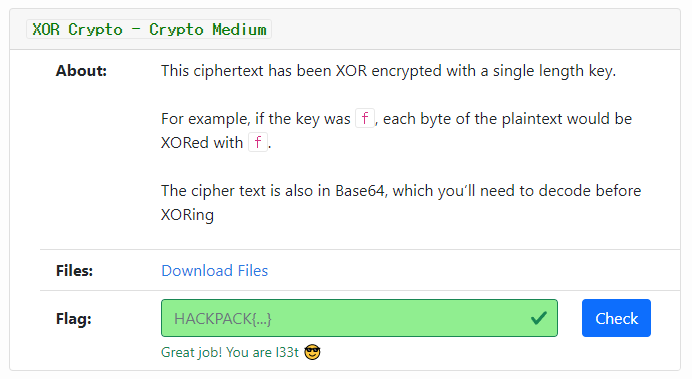 | [HackPack CTF] XOR Crypto(hard) - 암호학 / Base64 (38) | 2022.04.11 |
