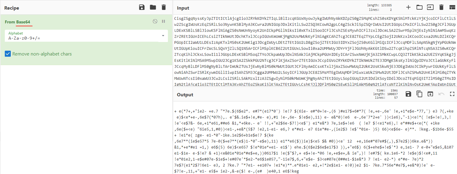 Cyberchef에 가서(https://gchq.github.io/CyberChef/) 일단 base64 부터 인코딩을 풀어본다.