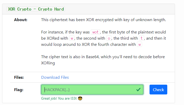 | [HackPack CTF] XOR Crypto(Medium) - 암호학 / Base64 (38) | 2022.04.11 |